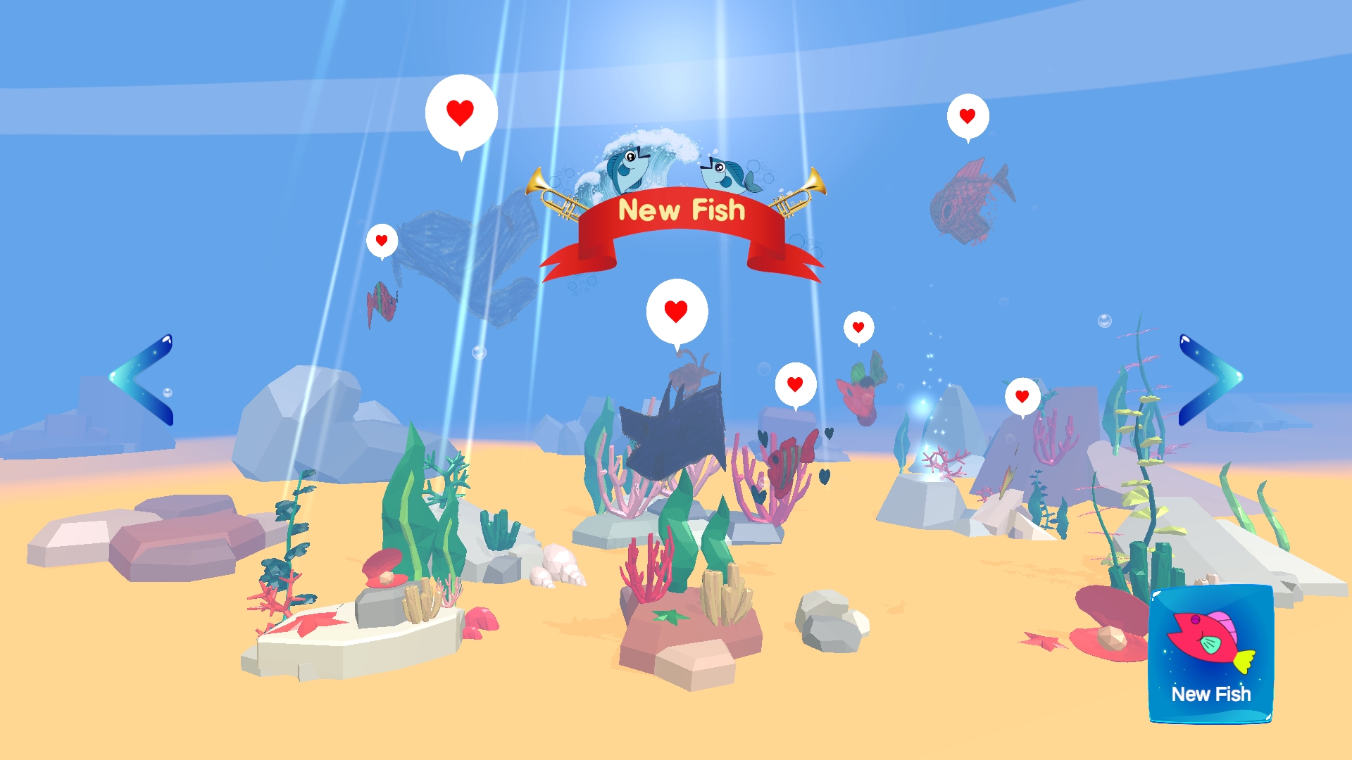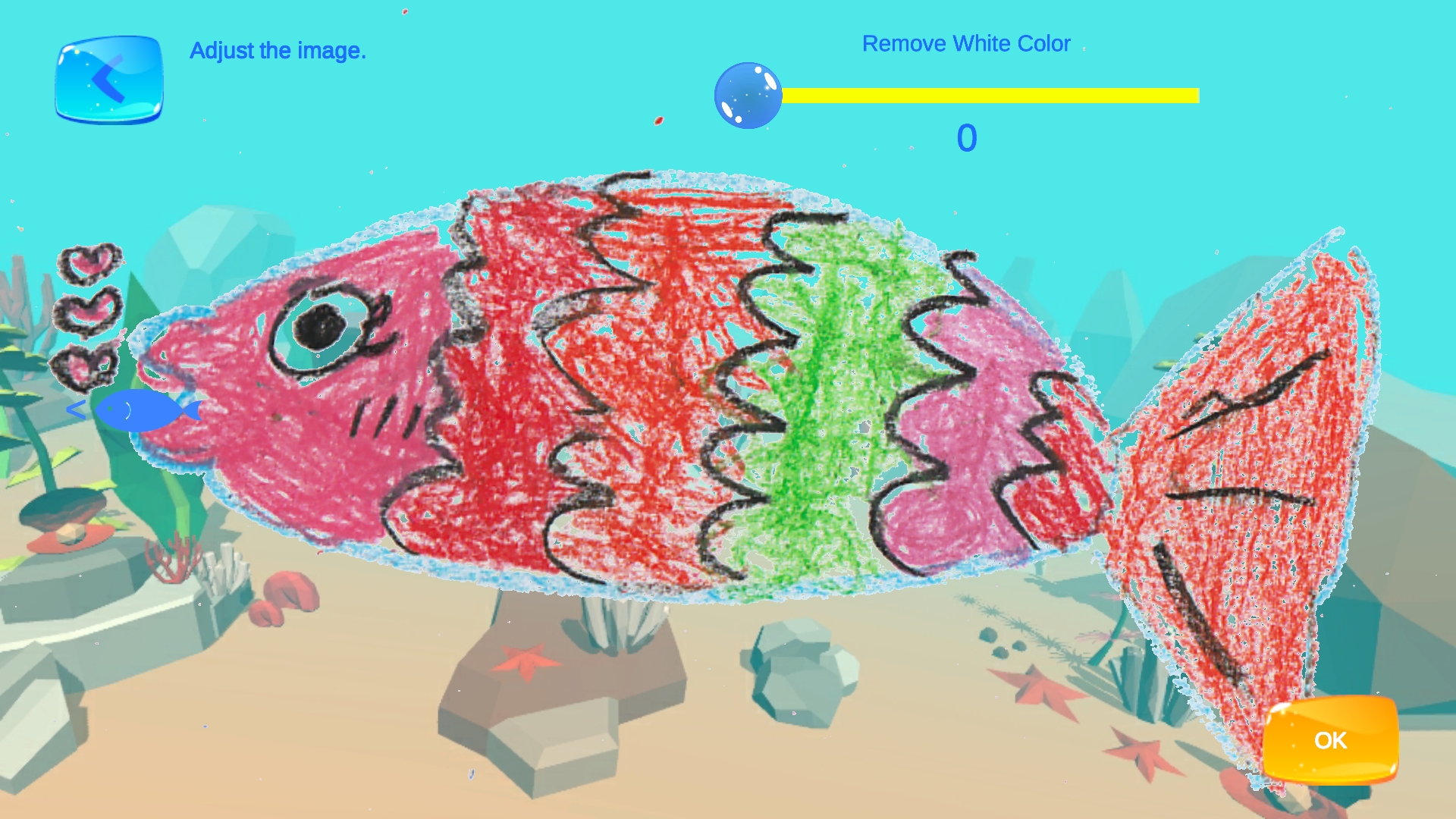 * Click on the fish to collect hearts. Hearts are used to make fish. How to use. 1. Prepare white paper. 2. Draw a fish picture. 3. Turn on the app and scan the image to apply. The white color becomes transparent after scanning. 4. If you want, you can sav