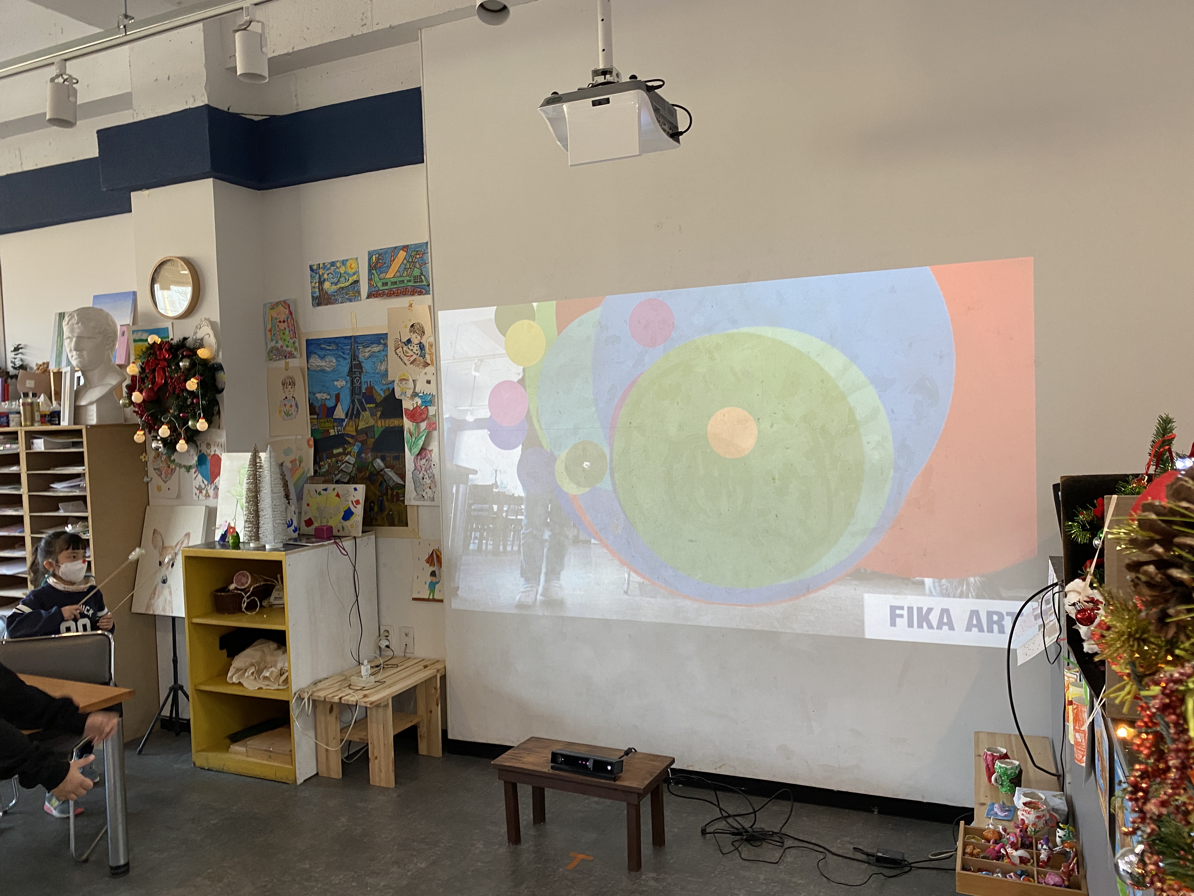 동작인식 센서를 이용한 융복합 미술활동. 손동작에 따라 원이 화면에 나타납니다. 렌덤한 색의 원을 배치하며 심미성을 탐구합니다.